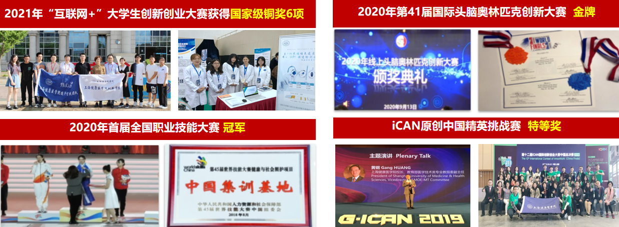此外,学校2019-2022年连续四年获得中国国际“互联网+”大学生创新创业大赛上海赛区优秀组织奖,学生报名数量保持在1000项以上,连续三年位居上海高校前三。2021年,在全国影响力最大的第七届中国国际“互联网+”大学生创新创业大赛上海赛区决赛中,健康学子斩获3金,8银,22铜。学校奖牌数量位居上海高校第1名,金奖数量位列上海本科高校第7名。2019年获得中华人民共和国第一届职业技能大赛健康与社会照护项目金奖、银奖。在第41届世界头脑奥林匹克决赛中荣获一金一铜,并得到陈群副市长接见和肯定。实现质量、数量双飞跃。