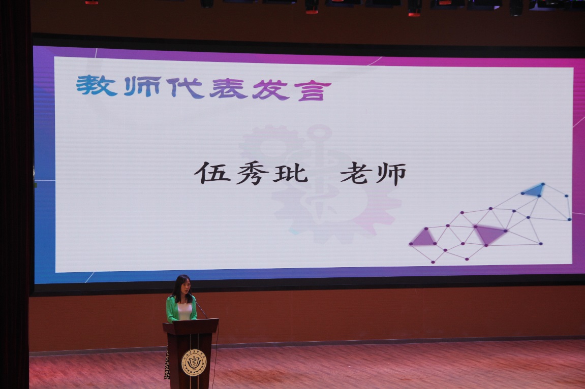 兼职辅导员、青年优秀教师伍秀玭作为教师代表发言。伍秀玭对新生们提出了提升软硬实力的建议,硬实力方面需要增强专业知识及技能,通过认真对待每一堂课和每一次作业、积极参加学科竞赛和学术沙龙,提升自己独立思考的能力;软实力方面需要提升自我修养,通过锻炼团队协作能力和管理能力,不断增加人际交往经验。