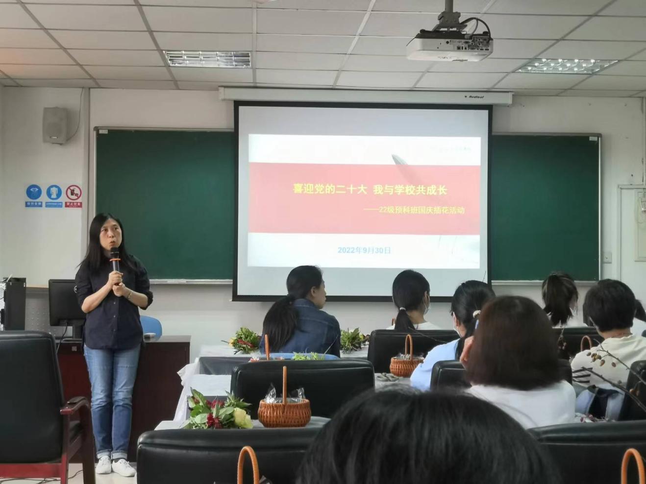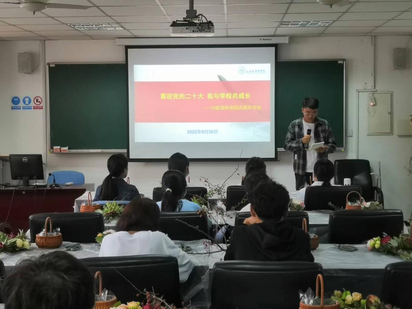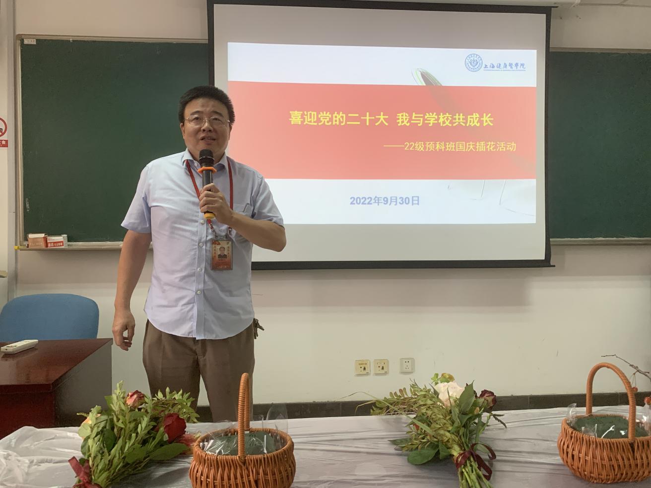 为了迎接祖国母亲73年华诞,喜迎党的二十大,弘扬爱国主义精神,积极倡导感恩祖国的良好风尚,基础医学院于9月30日组织2022级预科班同学与结对教师一起开展了“喜迎党的二十大 我与学校共成长”插花活动。院长杨智昉、党支部书记程伟出席。