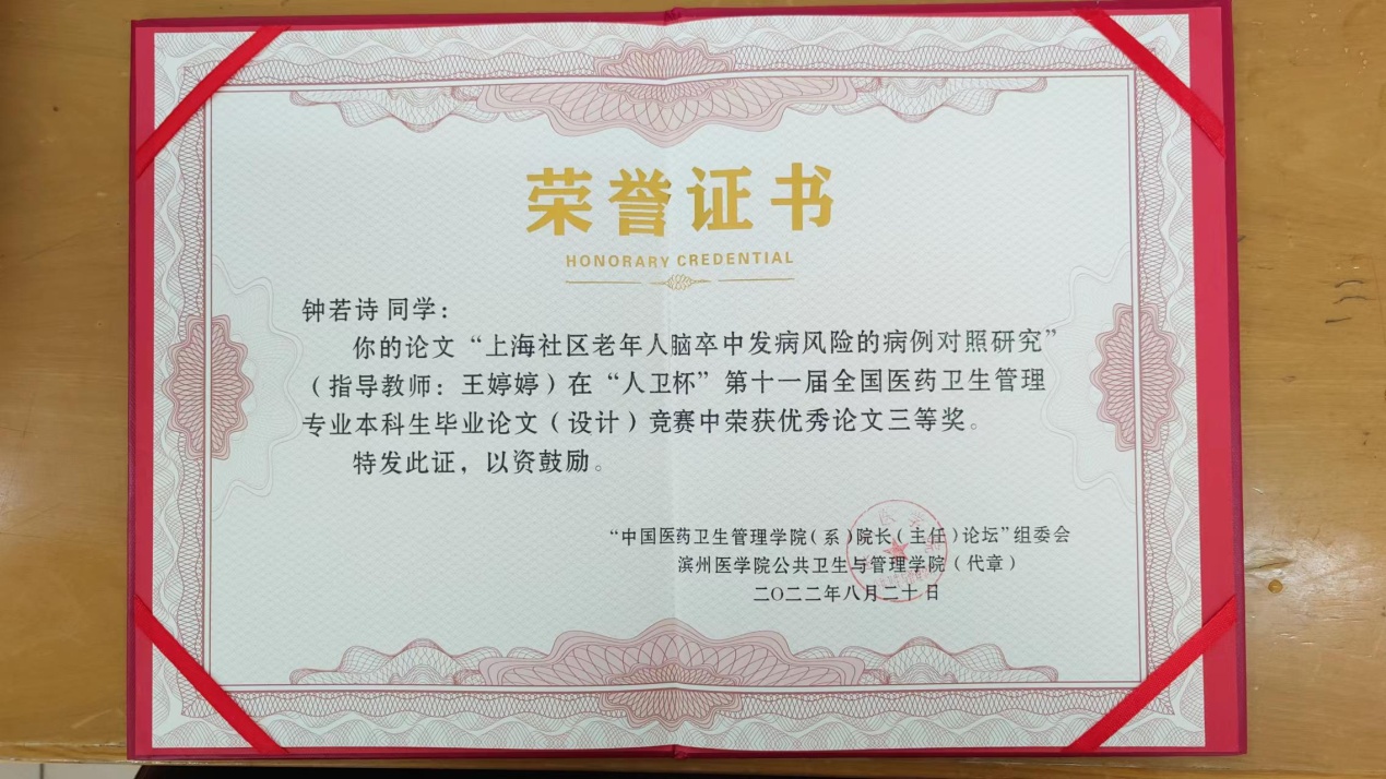 近日,由中国医药卫生管理大学联盟主办、滨州医学院承办的第十一届“人卫杯”全国医药卫生管理专业本科毕业论文(设计)大赛在烟台市落下帷幕。本届大赛共有全国双一流高校在内50所高校参赛,137篇合格论文进行最后角逐;经大赛组委会认真评选,评选出一等奖10篇,二等奖20篇,三等奖30篇。在beat365官方网站护理与健康管理学院王婷婷老师指导下,2018级健康服务与管理专业钟若诗同学撰写的毕业论文《上海社区老年人脑卒中发病风险的病例对照研究》在本次大赛中荣获三等奖。