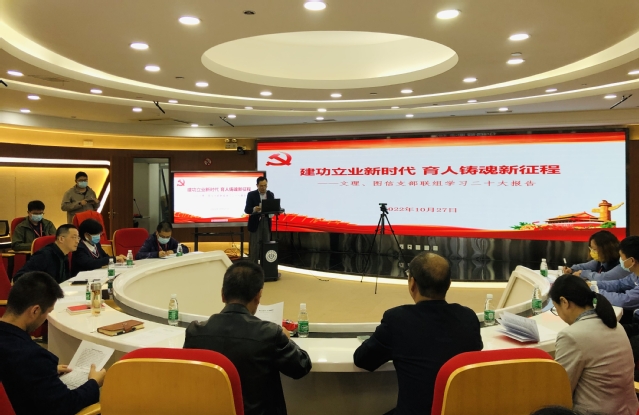 10月27日下午,文理、图信支部联组学习党的二十大报告,文理教学部全体教职工、图文信息中心支部全体党员齐聚南苑图书馆5楼报告厅,会议采取线上线下相结合的形式进行,会议由图文信息中心党支部书记王云光主持,马克思主义学院教授罗会德、图文信息中心主任彭骏、文理教学部直属党支部书记、主任耿铭与会做了主旨发言。