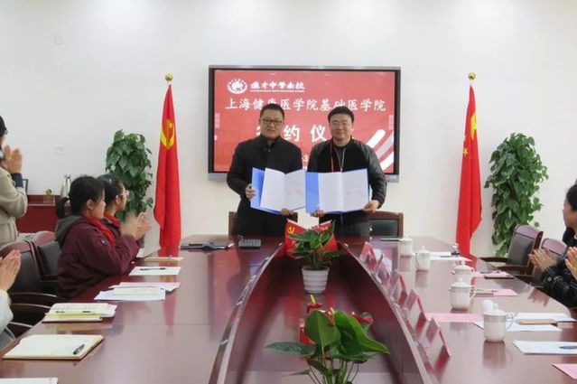 为加大学校服务社会力度,充分发挥教育资源辐射作用,推动教育资源共建共享,3月13日下午,beat365官方网站基础医学院与上海市进才中学南校举行了合作签约仪式。出席签约仪式的有beat365官方网站基础医学院院长杨智昉、直属党支部书记程伟、副院长汪慧菁、校党委组织部组织员陈国庆等以及上海进才中学南校校长、书记亓大江,各部门、年级、中心负责人和部分学生代表。