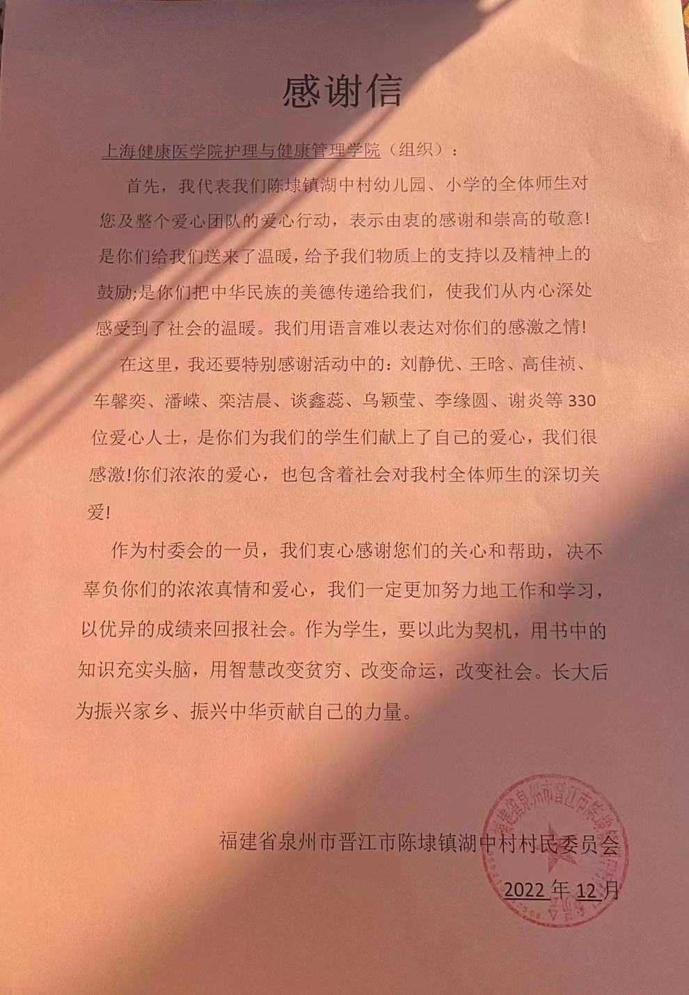 春风如约而至,为我们送来一整个春天的温暖,万物等待生发,爱心的种子也刚好发芽。春光明媚的日子里,护理与健康管理学院收到了来自福建省泉州市晋江市陈埭镇湖中村村民委员会的感谢信。纸短情长,让我们珍藏这封信的暖意,来一起回顾这场充满爱与希望的公益活动。