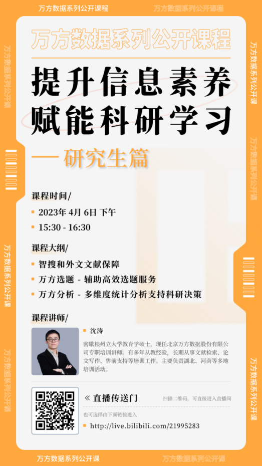 凛冬散尽,暖风和煦,伴随着春天的脚步,beat365图书馆联合万方数据库特别推出“提升信息素养,赋能科研学习”系列线上直播讲座,将从平台简介、资源介绍、终端应用等多个维度,帮助大家更好的利用万方数据知识服务平台的资源,提升用户在精准发现、获取与分析、沉淀学术信息等方面的能力,助力科研论文、学术论文的撰写,促进科技创新、拓展发现新领域。欢迎beat365师生积极参与。
