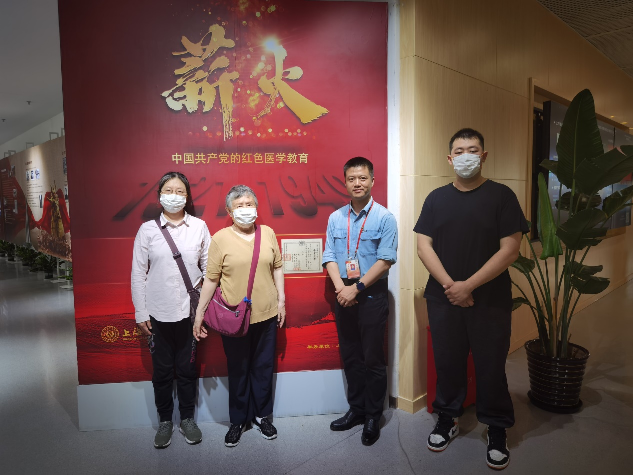5月29日下午,中华人民共和国成立前后曾任华北医科大学教育长陈淇园老先生的儿媳、孙女及曾孙一行来到南苑图书馆参观。这张珍贵的证书因其蕴含的历史意义从现代医学教育博物馆临时安置到正位于南苑图书馆一楼展区的“中国共产党的红色医学教育——《薪火》”展览中。彭骏为陈老先生的家人详细讲解展览,追忆中国共产党医学发展走过的历史,现年八十多岁的奶奶(陈淇园老先生儿媳)看到展板上一个个熟悉的名字,也不禁回忆讲述起一段段红色医学教育发展的历史。