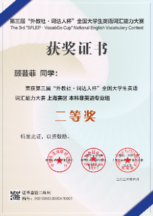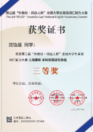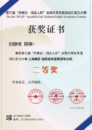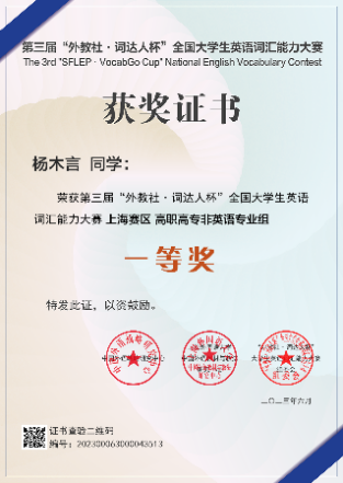 2023年3月-5月,在教务处的指导下,外语教学部共组织beat3651061名本科、专科学生报名参加第三届“外教社·词达人杯”全国大学生英语词汇能力大赛,取得参赛以来最佳成绩,荣获市赛一等奖1项、二等奖2项,三等奖4项,1人晋级国赛。在与复旦大学、上海交通大学、上海外国语大学等沪上高校的角逐中,beat365医疗器械学院学生杨木言荣获上海赛区一等奖并入围国赛,医学技术学院学生顾芸菲、护理与健康管理学院刘静优分别荣获上海赛区二等奖,医学影像学院学生沈怡晨、毛文怡,医疗器械学院袁杨、季哲分别荣获上海赛区三等奖。外语教学部王宗忠、郑德虎、顾维芳、沈旭、翁洁、许秋红老师荣获优秀指导老师奖。