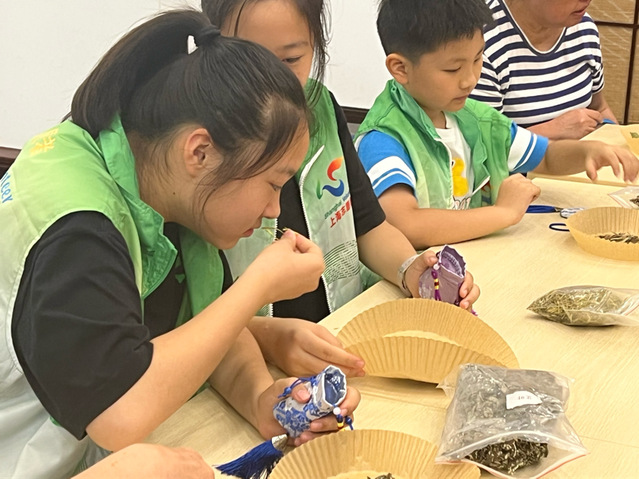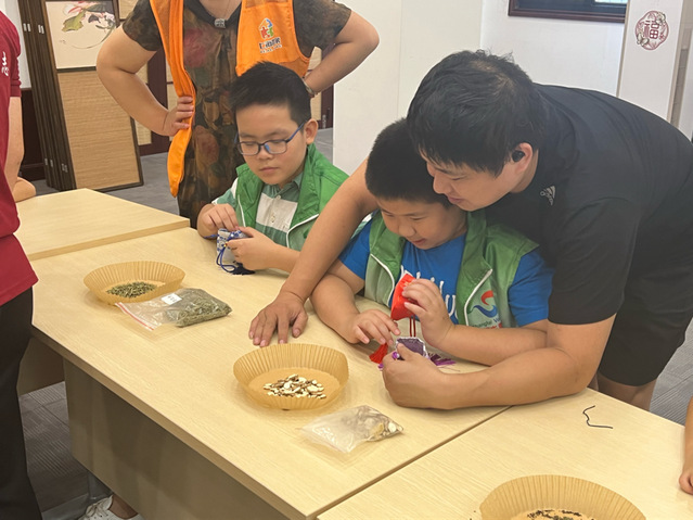 带领老人和孩子们学习了中医文化相关知识后,自然少不了实践动手的时间。团队成员从香囊的款式与妙用入手,让老幼朋友们通过看、闻、摸、尝、称等体验方式,从气味、形状、味道、功效等多个方面辨别多种不同中草药,并熟悉其基本功效与用法。根据自身的喜好与需求,在团队成员正确规范的引导下,共同制作起了每个人独一无二的香囊,进一步加强了老幼群体的交流及动手能力。
