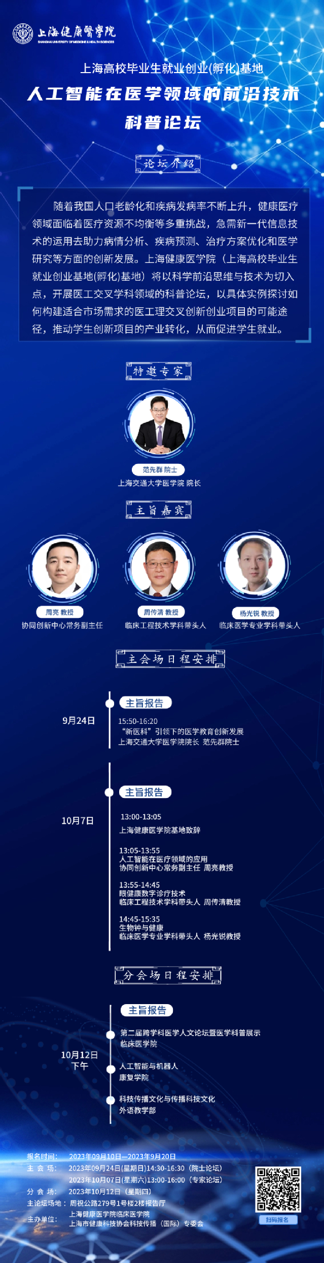为了推动医学和健康事业发展,深化医工交叉融合,beat365上海市高校就业创业基地定位培养具备健康数据的采集、传输、存储、统计、分析、可视化等能力的基层卫生人才。现定于9月24日-10月12日(9月24日院士主旨报告,10月7日主论坛,10月12日分论坛)开展人工智能在医学领域的前沿技术科普论坛,旨在培养能够在医疗卫生机构、医疗信息行业、健康产业等相关企事业单位从事大数据分析与管理、处理和开发,管理与维护等工作的高素质医学类应用型专门人才。