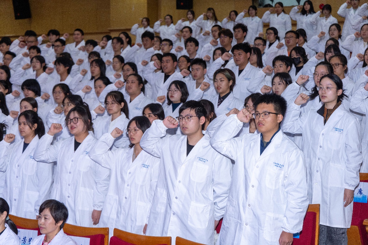 在蔡巧玲的带领下,医学生们右手握拳,以积极昂扬的精神面貌,庄严宣誓医学生誓言。铿锵誓言久久回荡,表达了医学生们献身医学的决心,坚定的理想信念,不忘初心,共同传承“敬佑生命、救死扶伤、甘于奉献、大爱无疆”的医学职业精神。