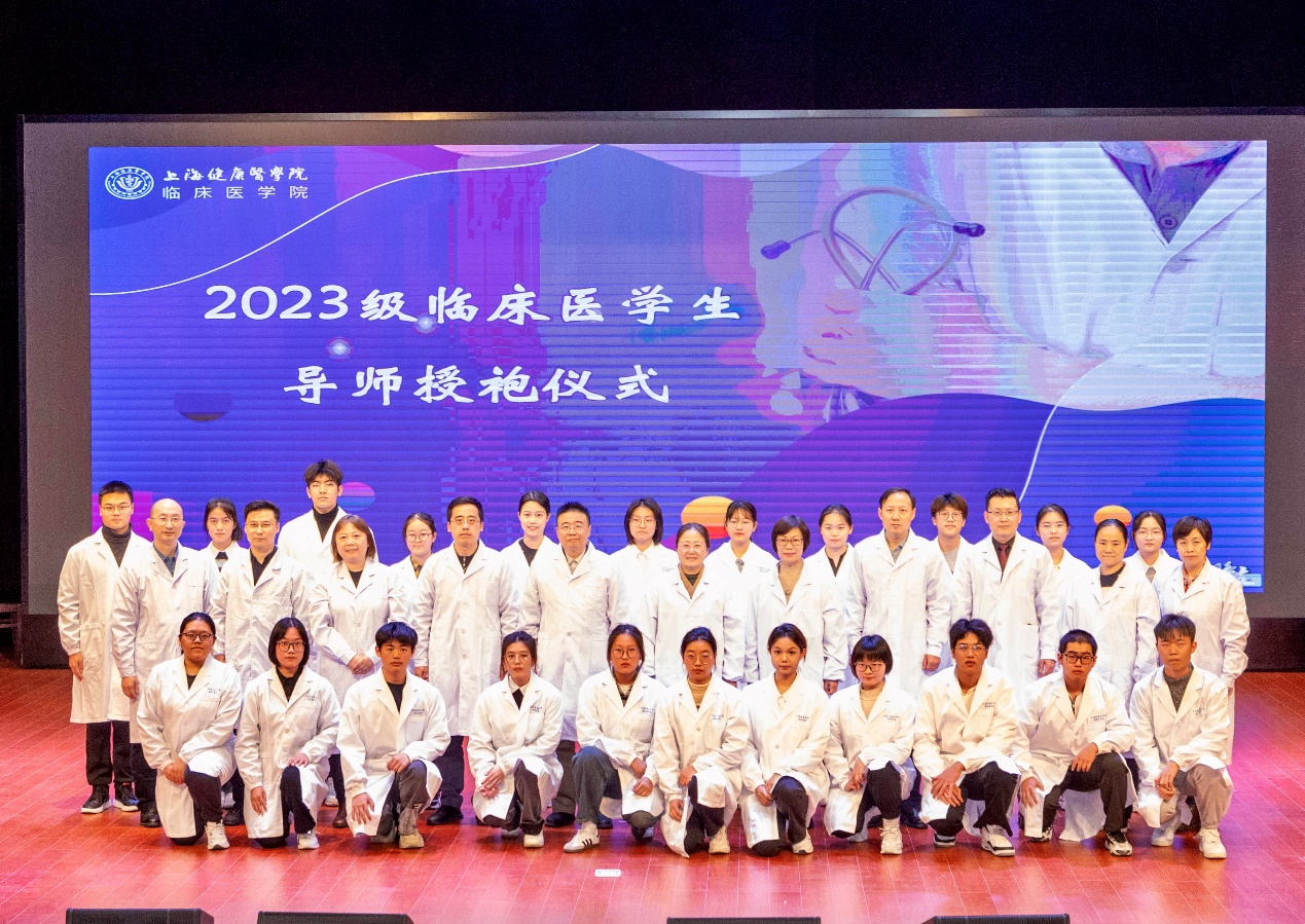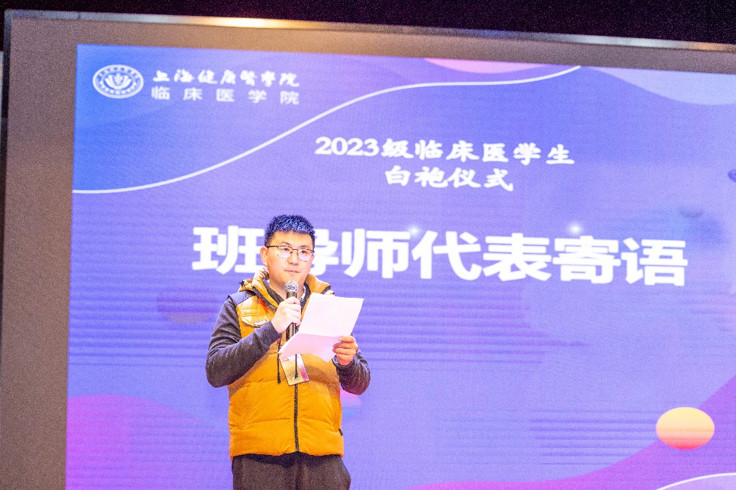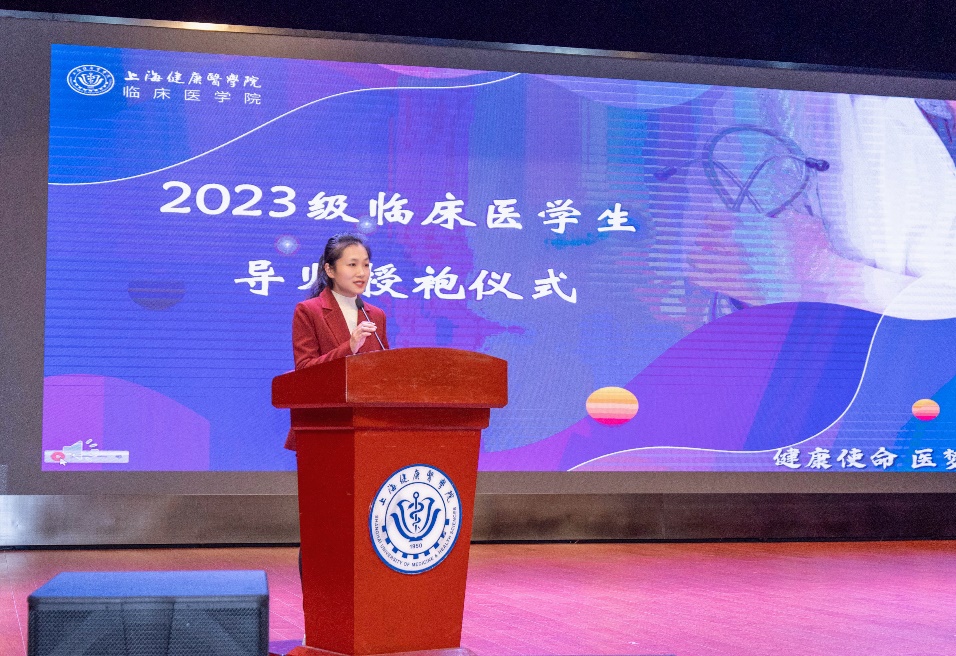 11月30日下午,“健康使命·医梦起航”——2023级临床医学生白袍仪式在北苑1号楼400人报告厅隆重举行。校党委书记郭永瑾、临床医学院原院长蔡巧玲、临床医学院常务副院长杨光锐、基础医学院院长杨智昉、附属崇明区中心医院副院长黄鹏、附属奉贤区中心医院副院长孙振亮、附属周浦医院沈艺教授、第六人民医院临港院区谢芳艺教授、附属嘉定区中心医院王飞教授、学工部副部长慈兴强、基础医学院、文理教学部、协同科研中心相关部门老师,临床医学院全体教师、2023级临床医学本专科共计234名学生参加仪式。仪式由临床医学院党总支副书记罗瑾琰主持。