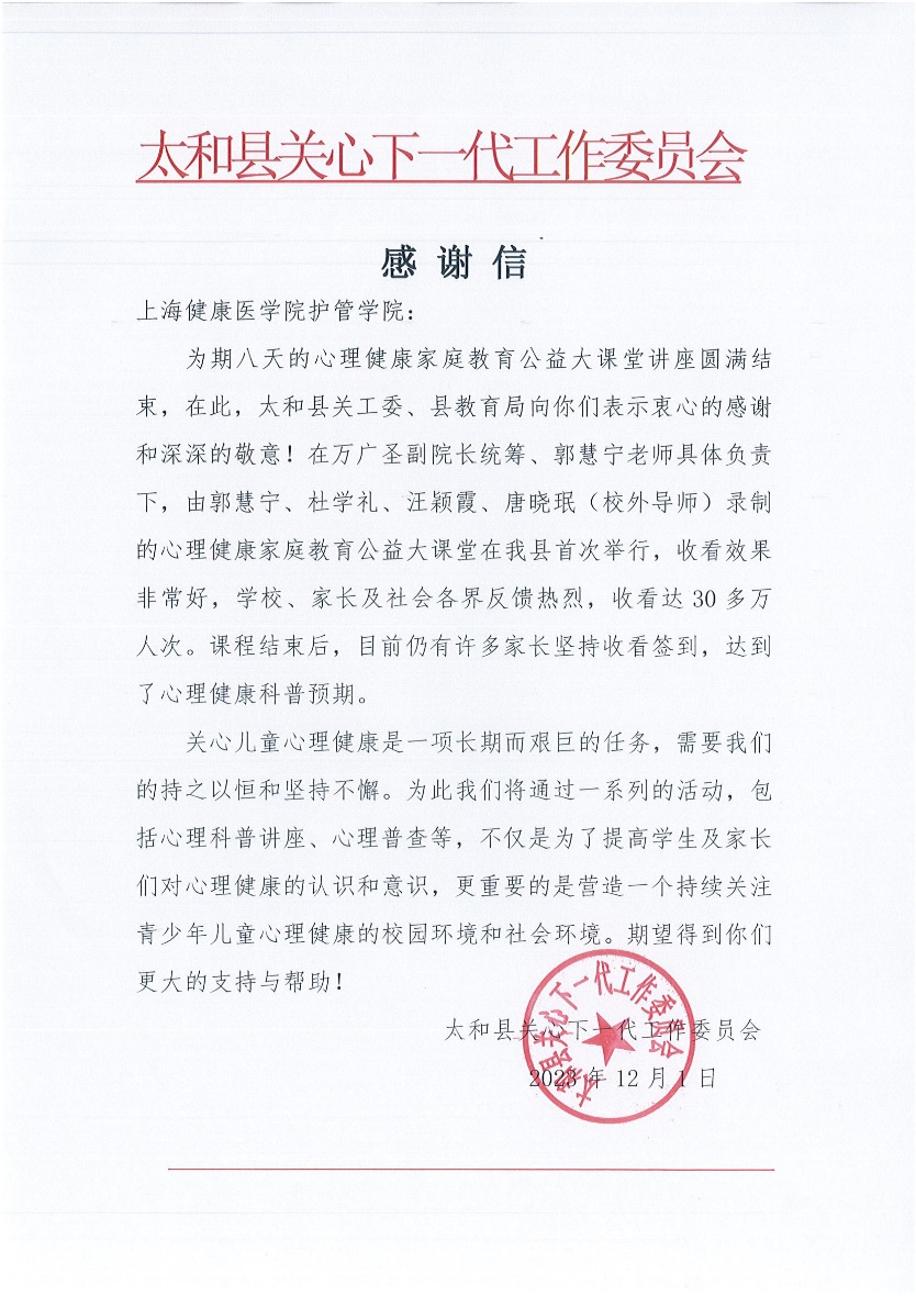 此次活动属于“中国校园健康行动·童梦同行守护成长”公益活动的一部分,本次系列讲座的成功举办是beat365官方网站、中国校园健康行动领导小组办公室、太和县关心下一代工作委员会、太和县教育局共同努力的结果,体现了四方在关心青少年儿童心理健康方面的责任担当和务实行动。此次合作不仅为太和县的青少年儿童带来了福音,也为全国范围内关注青少年儿童心理健康的家庭、学校和社会各界树立了榜样,期待未来更多此类有益于青少年儿童心理健康的活动在全国范围内得到推广和实践,为培养德智体美劳全面发展的社会主义建设者和接班人添砖加瓦。