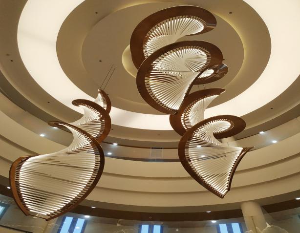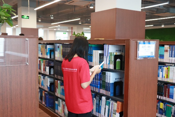 同学们被书架上的医学类书籍所吸引,不停地翻看着,问:“学长,你们平时都学些什么?”学长为他们介绍了我们学校的不同学院、不同专业所学习的课程。同学们指着一个男生说道:“他就是个想学医的!”,原来问答之间,已经为同学们实现自己的梦想插上了一双刚刚具有雏形的翅膀。来到图书馆一楼集合时,所有人都被大厅上方的吊饰吸引,这是三条DNA双螺旋结构链,同学们和志愿者们共同赞叹:设计太巧妙了,学术氛围浓厚的图书馆处处显示了医学元素。
