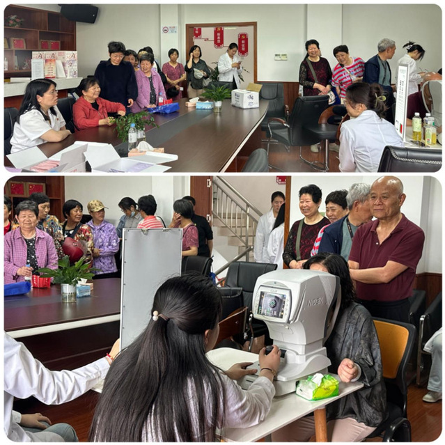 眼视光专业教师和学生志愿者们正在为居民们进行视力检查和验光
