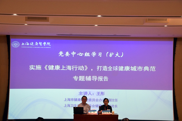 9月18日下午,校党委中心组在北苑1号楼200人报告厅举行“不忘初心、牢记使命”主题教育集中学习。本次学习邀请了上海市卫健委健康促进处处长王彤来校作“实施《健康上海行动》,打造全球健康城市典范”专题辅导报告,全体校领导、中层干部、教研室主任等参加了学习。报告会由党委书记、主题教育领导小组组长郑沈芳主持。