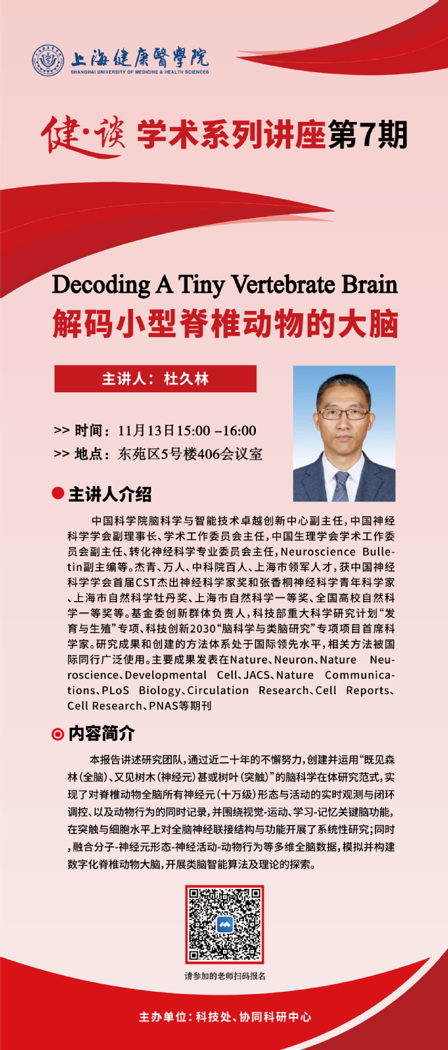 【健·谈】第7期学术系列讲座将于11月13日15:00在东苑5号楼406会议室举办,本次特邀嘉宾是中国科学院脑科学与智能技术卓越创新中心副主任,中国神经科学学会副理事长学术工作委员会主任杜久林教授。他是杰青、万人、中科院百人、上海市领军人才,获中国神经科学学会首届CST杰出神经科学家奖和张香桐神经科学青年科学家、上海市自然科学牡丹奖、上海市自然科学一等奖、全国高校自然科学一等奖等。基金委创新群体负责人,科技部重大科学研究计划“发育与生殖”专项、科技创新2030“脑科学与类脑研究”专项项目首席科学家。研究成果和创建的方法体系处于国际领先水平,相关方法被国际同行广泛使用。主要成果发表在Nature、Neuron、Nature Neuroscience、Developmental Cell、JACS、Nature Communications、PLoS Biology、Circulation Research、Cell Reports、Cell Research、PNAS等期刊