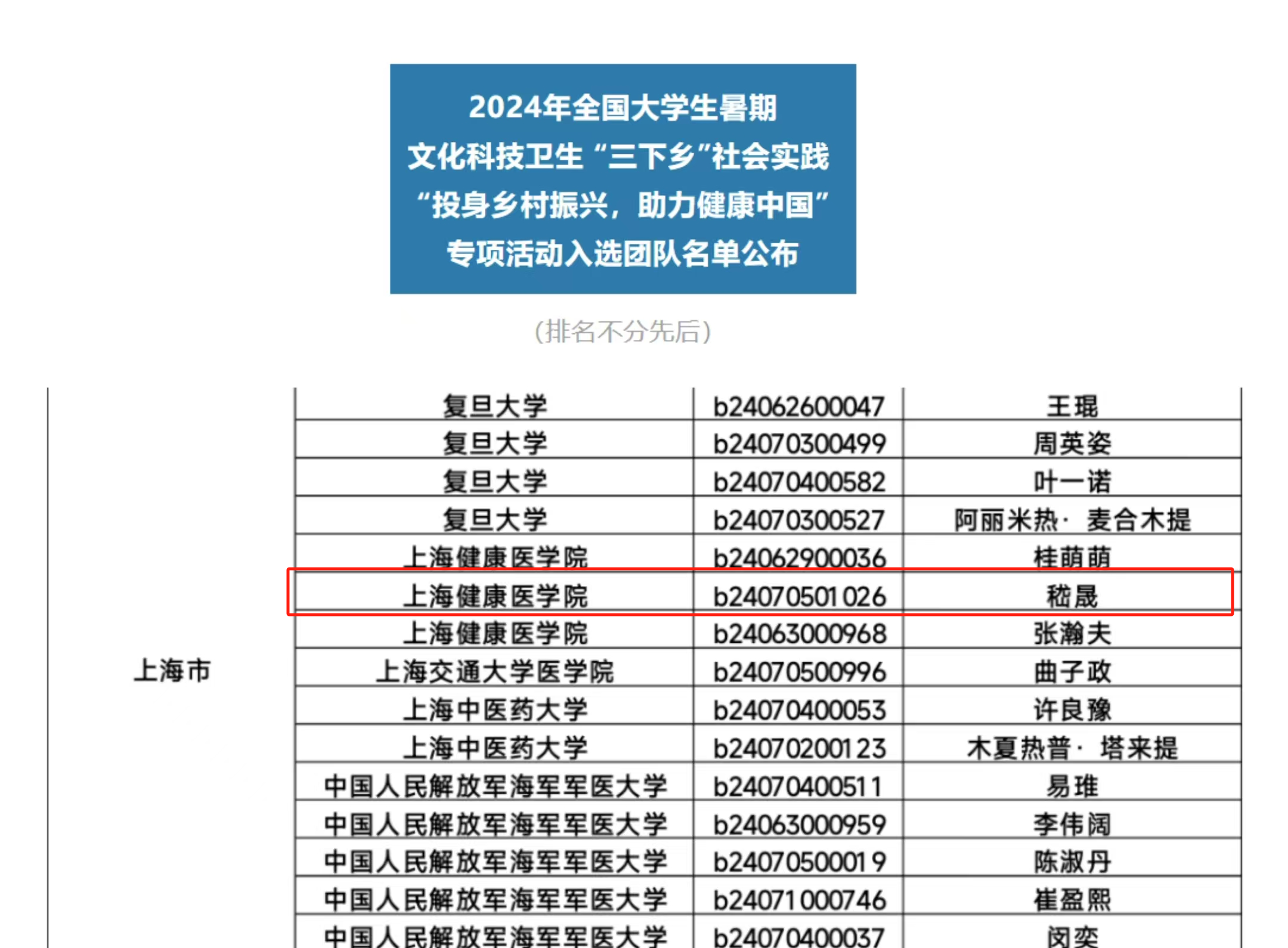 2024年全国大学生暑期文化科技卫生“三下乡”社会实践“投身乡村振兴,助力健康中国”专项活动得到全国各医药类高校团队的广泛关注,在全国众多医学院校中遴选出300支大学生社会实践团队,共有来自108所学校的2764名大学生入选,beat365护管学院AHFE团队项目“医缘庐江党建牵,分级诊疗心相连”成功入围,上海仅15支团队入围。
