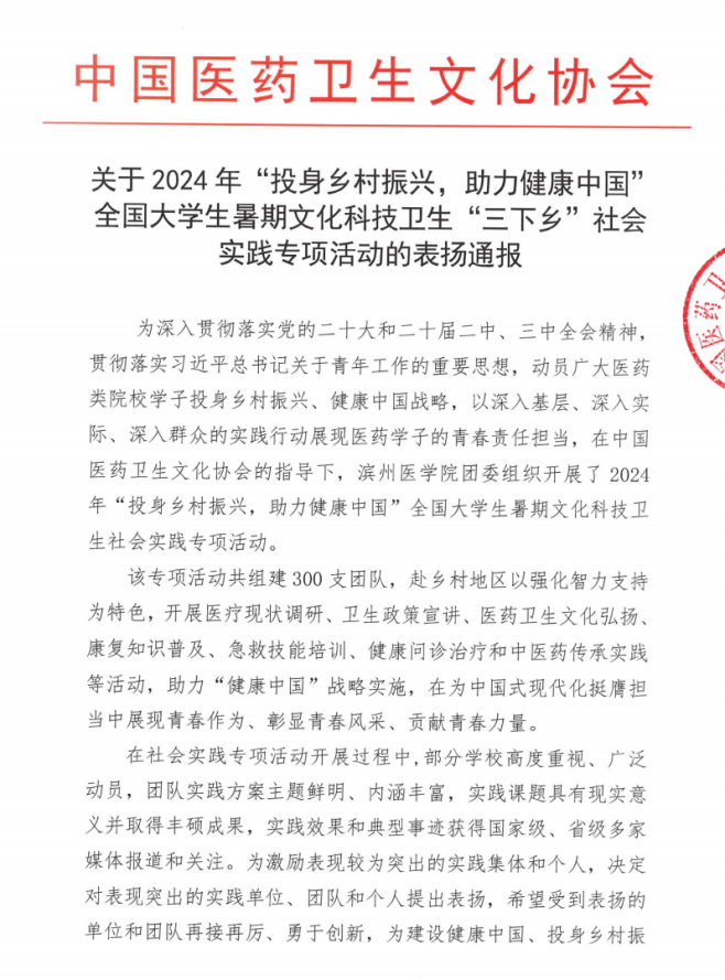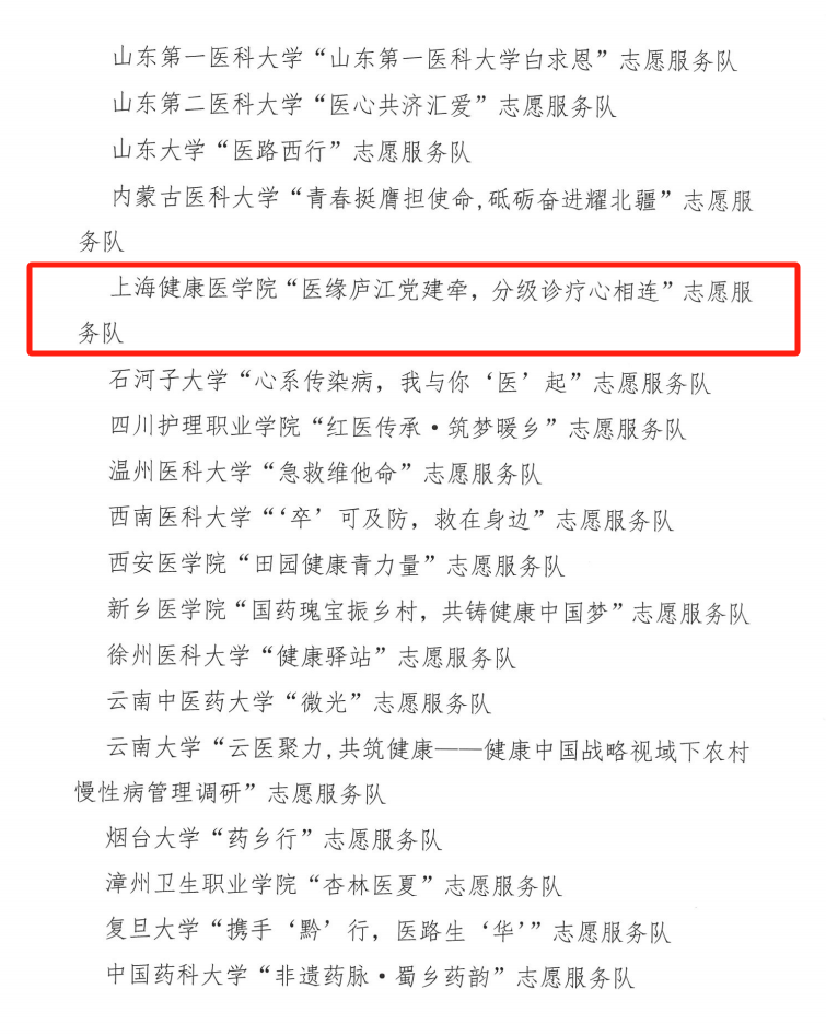 近日,由中国医药卫生文化协会指导,依托全国医药类高校共青团工作联盟组织开展的2024年全国大学生暑期文化科技卫生“三下乡”社会实践“投身乡村振兴,助力健康中国”专项活动,得到医药类院校师生的大力支持,同时对表现较为突出的实践集体和个人予以表扬通报。护理与健康管理学院的人人主动健康(AHFE)团队组建的beat365官方网站“医缘庐江党建牵,分级诊疗心相连”志愿服务队获评全国“表现突出团队”(上海仅2支团队获评)。