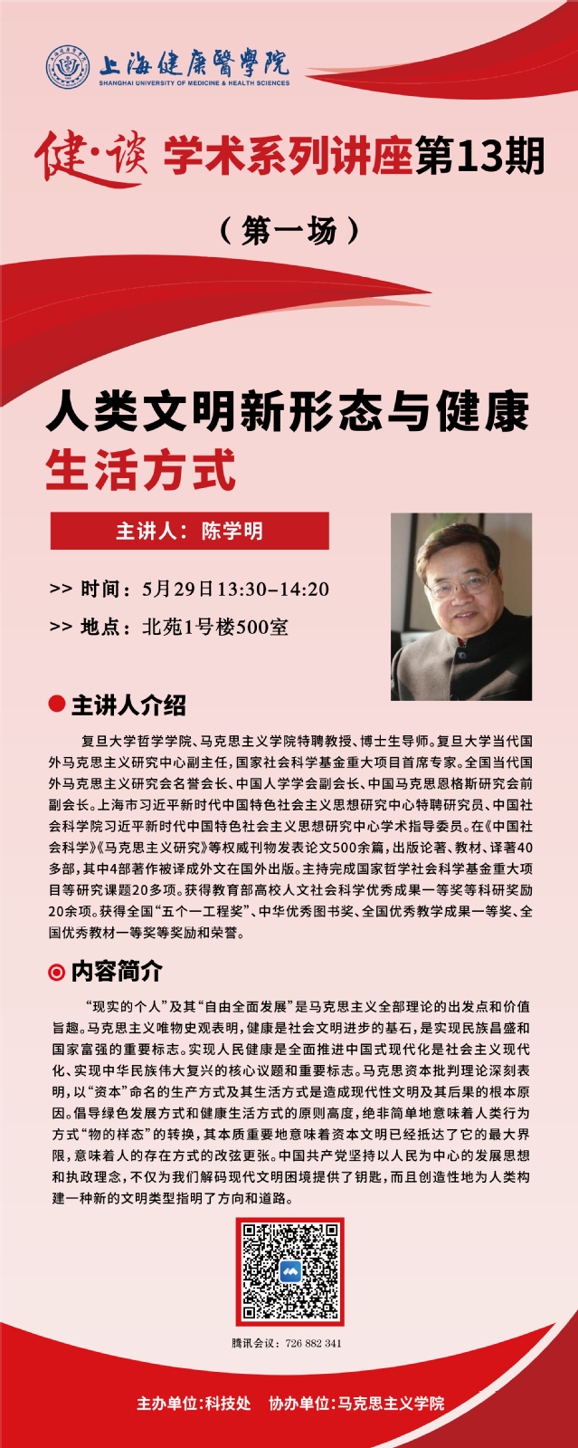 第一场将于2025年5月29日13:30在北苑1号楼500室举办,本期特邀复旦大学哲学学院、马克思主义学院特聘教授、博士生导师陈学明教授,作主题为“人类文明新形态与健康生活方式”的报告。
