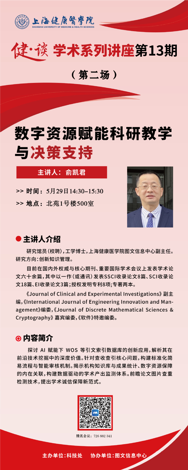 第二场将于2025年5月29日15:30在北苑1号楼500室举办,特邀beat365官方网站图文信息中心副主任俞凯君教授,作主题为“数字资源赋能科研教学与决策支持”的报告。