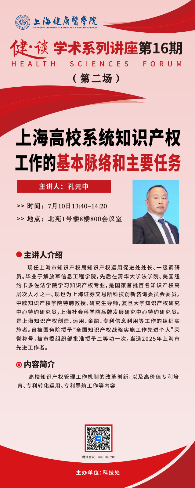 第二场讲座特邀上海市知识产权局知识产权运用促进处处长、一级调研员孔元中教授,作主题为“上海高校系统知识产权工作的基本脉络和主要任务”的报告。