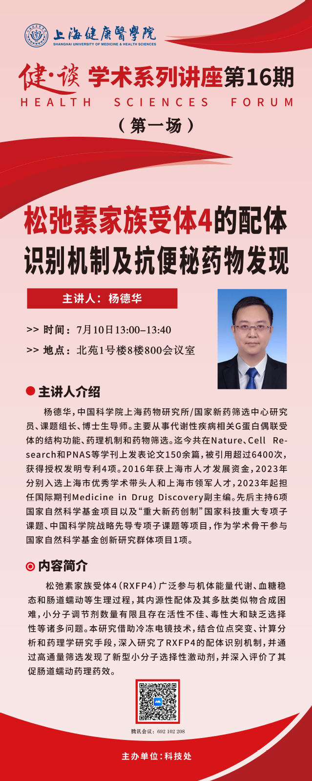 第一场讲座特邀中国科学院上海药物研究所/国家新药筛选中心研究员、课题组长、博士生导师杨德华教授,作主题为“松弛素家族受体4的配体识别机制及抗便秘药物发现”的报告。