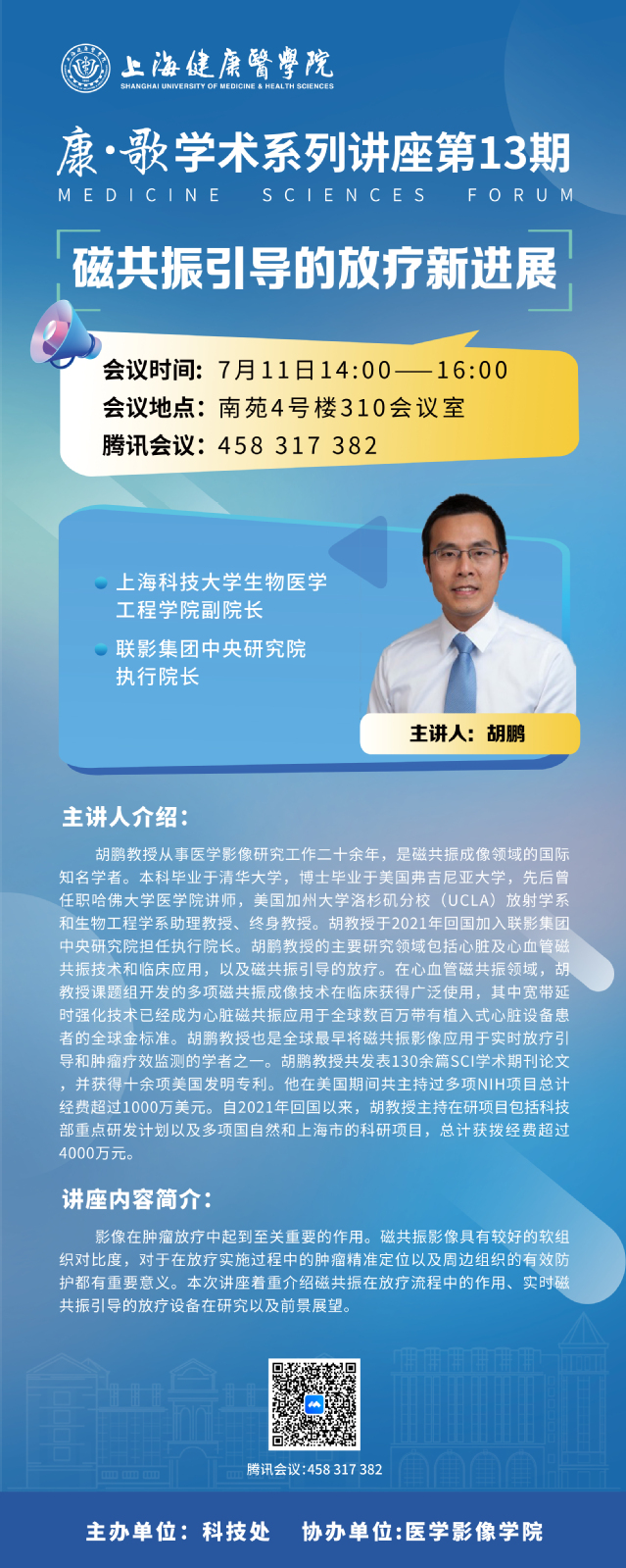 【康·歌】学术系列讲座第13期将于7月11日14:00在南苑4号楼310会议室举办。本期特邀上海科技大学生物医学工程学院副院长、联影集团中央研究院执行院长胡鹏教授作主题为“磁共振引导的放疗新进展”的报告,内容将着重介绍磁共振在放疗流程中的作用、实时磁共振引导的放疗设备在研究以及前景的展望。