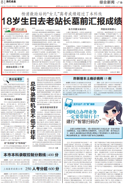 小樑在高考中获得优异成绩的新闻登上2020年新民晚报。