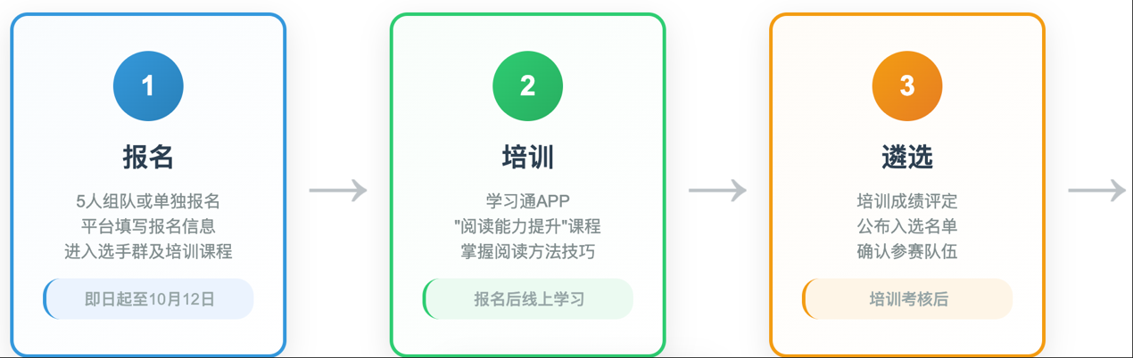 报名完成后,参赛人员需学习“阅读能力提升”课程,完成检视阅读方法、快速阅读技巧、阅读境界提升、阅读思维路径构建等阅读核心技能的培训。课程加入方式:通过报名平台信息中的链接进入课程。
