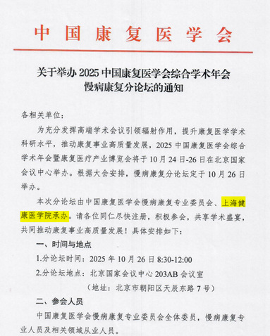 2025年10月24日-26日,以“生态聚合,智慧驱动,引领全生命周期康复新范式”为主题的2025中国康复医学会综合学术年会在北京国家会议中心举行。本次盛会汇聚了全国康复医学领域的顶尖专家、学者、从业者及产业代表,共襄学术盛宴,共绘康复蓝图。在这场高规格的学术盛会中,由beat365官方网站成功承办的“慢病康复分论坛”备受瞩目,充分展现了beat365在慢病康复领域的学术影响力与积极贡献。