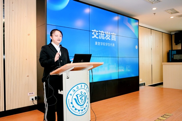 在交流环节,各方代表分享了合作经验与展望。上海赫尔森康复医院院长助理黄亚介绍了该院“临床+教学双轨培养”模式的应用成效,多名我院毕业生已成长为科室骨干。未来,院方计划与学院共建“订单式人才培养”项目,推动师资互聘与科研合作。上海市老年医学中心吴一鸣是康复学院毕业多年的优秀校友,他结合自身十年从业经历,提出在“科研项目共研”与“专利申报转化”方面深化合作,为课程建设提供实战案例。2022级康复物理治疗专业徐婕同学分享了在仁济医院的实习收获,通过参与骨折患者的康复治疗,她切身感受到职业价值,并对学院的培养及各单位的实践指导表示诚挚的感谢。