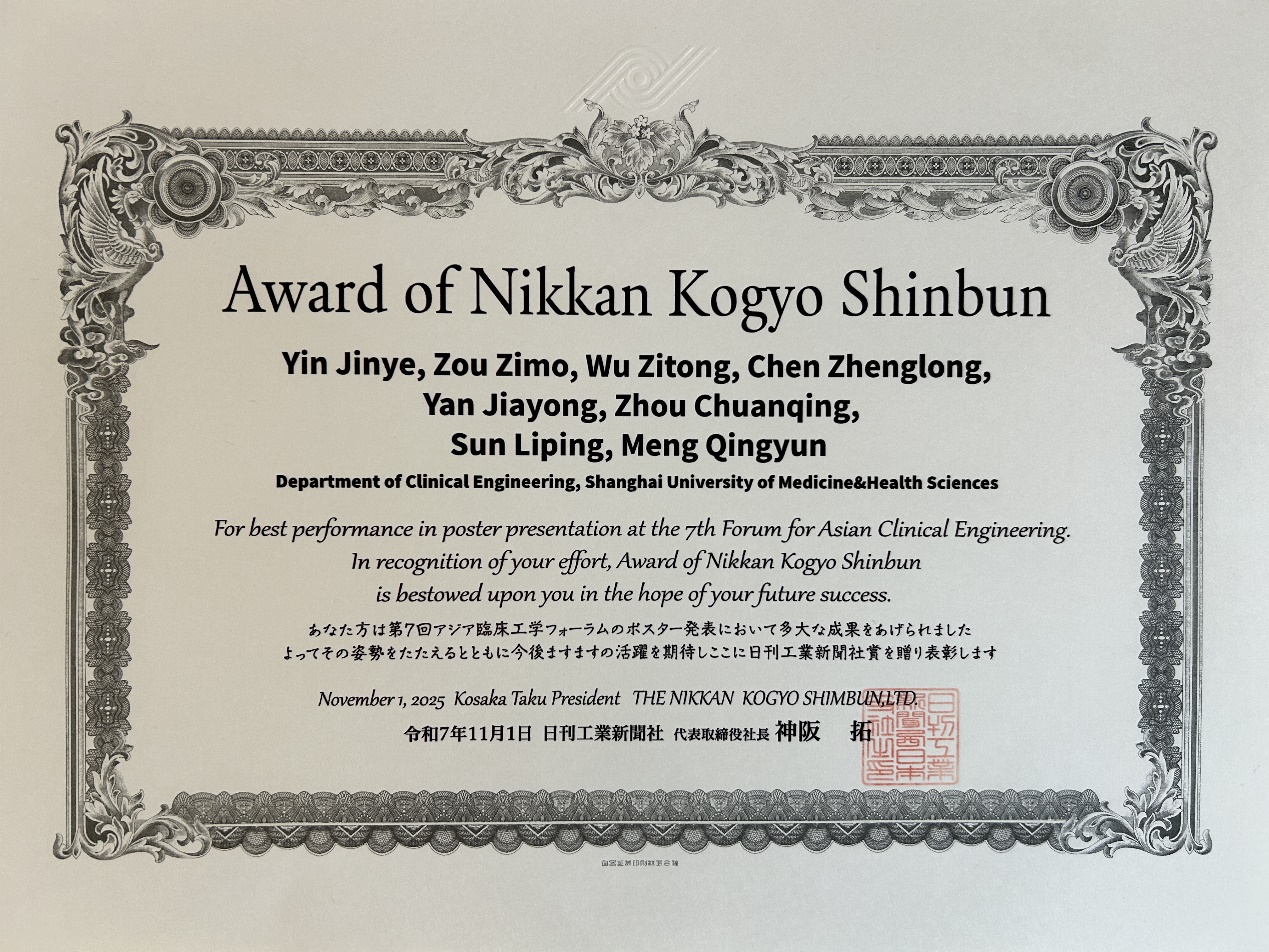 医疗器械学院派出两支代表队参加本次论坛壁报交流,经专家评议,壁报“基于手势识别的手部外骨骼康复系统设计与研究”(学生:印金烨、邹子默、吴子彤)在亚洲各国20支参赛队伍中脱颖而出,荣获日刊工业新闻(Nikkan Kogyo Shinbun)社颁发的最佳壁报奖,在国际舞台上再一次展示了beat365临床工程技术专业学生的专业素养。
