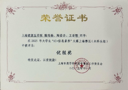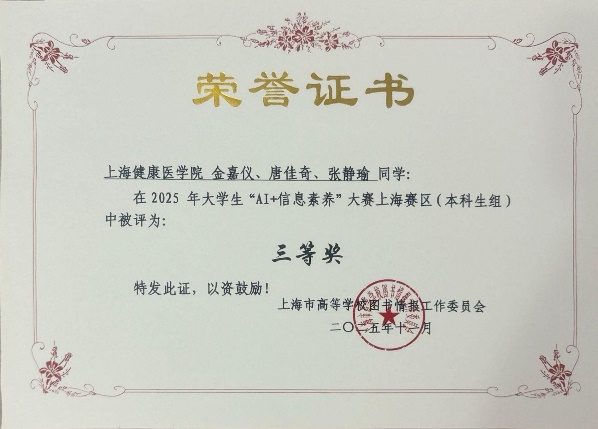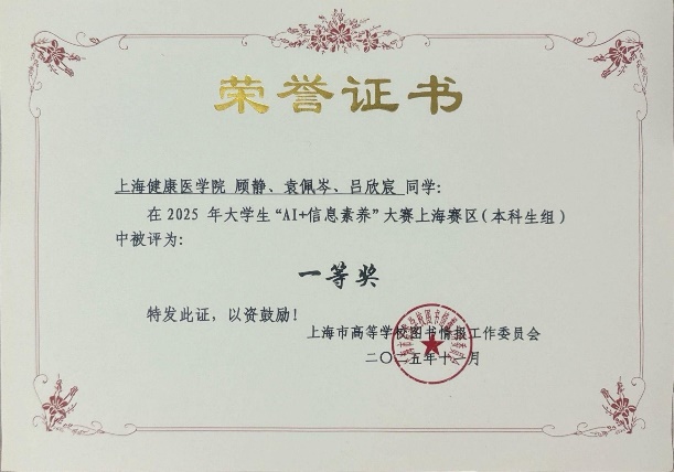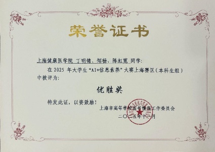 自大赛启动以来,图文信息中心高度重视,系统开展赛前培训、模拟演练和专题辅导。参赛团队通过AI工具实现信息的高效筛选、深度分析与创新呈现,既展现了扎实的专业功底,又凸显了“AI+医学”的创新应用潜力,最终提交的开放主题作品构思新颖、切合实际,获得了评审专家的高度认可:“赛博荷鲁斯队”(顾静、袁佩岑、吕欣宸)凭借精准的AI工具应用与严谨的问题解决方案,荣获一等奖;“信创未来队”(金嘉仪、唐佳奇、张静瑜)聚焦健康信息科普场景,荣获三等奖;“健康喵喵队”(金展亦、陆俊奕、胡嘉予)、“学医到底对不队”(丁明锦、邹杨、陈虹霓)、“量子智脑队”(魏鸣畅、陶姿亦、王译慜)三支队伍凭借扎实的基础能力与创新探索,荣获优胜奖。