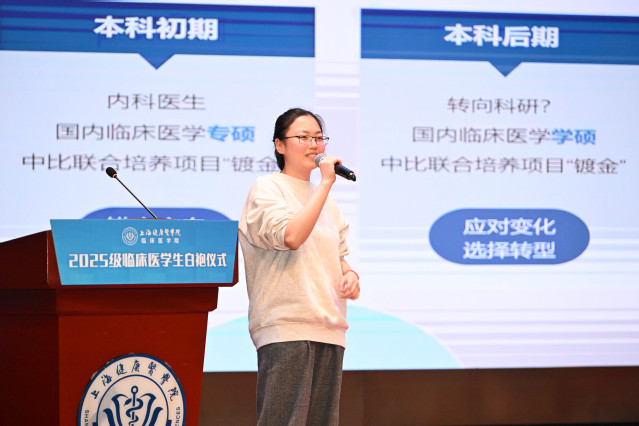 仪式尾声,学院向全体新生发出号召,期望大家怀揣理想,融合科学精神与人文关怀,坚定走好医学之路。随后举办的“医路青年说”活动中,2024届优秀毕业生、比利时列日大学博士生孙心怡与巴尼亚卢卡大学海外交流项目学生代表,结合自身经历分享了职业规划与国际研修体验。他们的分享旨在引导新生明晰发展方向、开阔全球视野,为其医学征程的开启注入信心与动力。