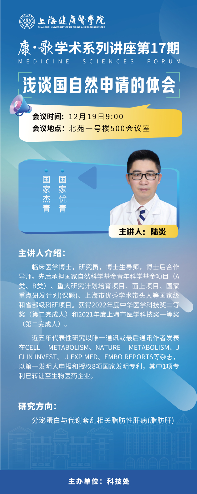 【康·歌】学术系列讲座第17期将于12月19日9:00在北苑1号楼500会议室举办。本期特邀上海交通大学医学院博导,上海市优秀学科带头人,国家杰青陆炎研究员作主题为“浅谈国自然申请的体会”的报告。内容将着重介绍国家自然科学基金申报的核心要求,系统解析项目凝练思路、科学问题提炼方法及创新点构建策略。