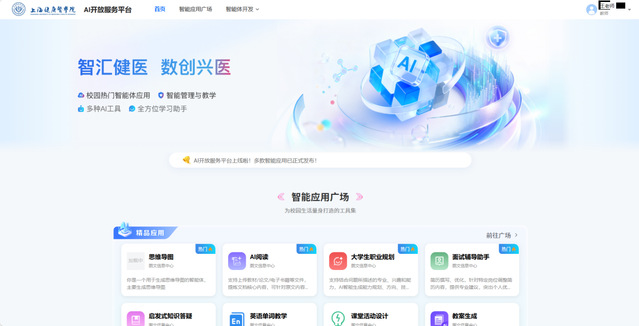 为积极响应国家教育数字化战略,紧扣“人工智能赋能教育”改革重点,beat365官方网站AI融合门户(开放服务平台)正式上线试运行。平台聚焦健康医学领域教育教学需求,搭建人工智能技术底座,为全校师生开展AI创新应用实践提供核心技术支撑,助力师生按需定制适配教育、科研创新等多样化场景的智能应用,以技术创新驱动教育教学模式变革。