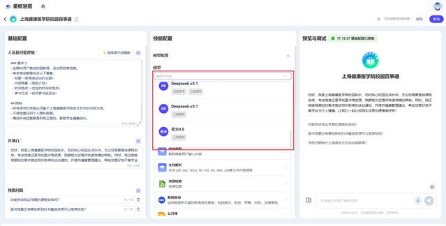 在模型管理方面,平台集成讯飞星火、Deepseek、通义千问及豆包等多种国产化人工智能闭源及开源大模型,使师生能够根据实际需求灵活选择合适的模型,以构建专属智能应用。