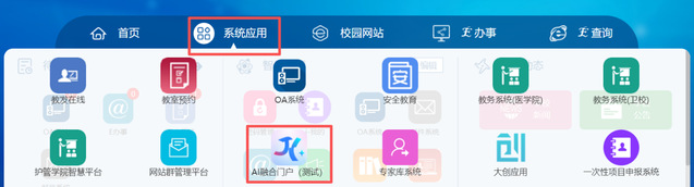 1.访问入口:直接点击学校官网首页右侧快速通道栏“AI融合门户”,或按“智慧门户/系统应用/AI融合门户(测试)”路径访问;