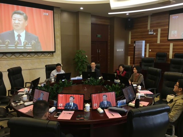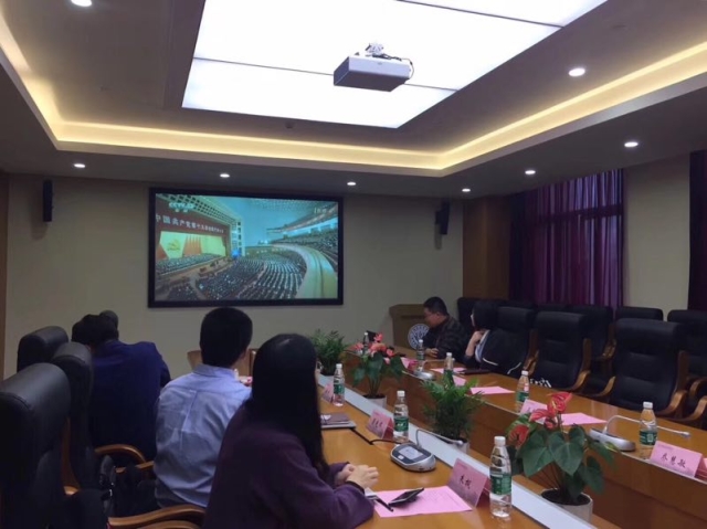 10月18日上午9时,中国共产党第十九次全国代表大会在北京人民大会堂隆重开幕。学校党委组织中心组成员(扩大)集体收看学习习近平同志《不忘初心,牢记使命,高举中国特色社会主义伟大旗帜,决胜全面建成小康社会,夺取新时代中国特色社会主义伟大胜利,为实现中华民族伟大复兴的中国梦不懈奋斗》的报告,校党委书记郑沈芳主持学习会,全体校领导、中心组成员和党总支(党支部)书记近70人参加。