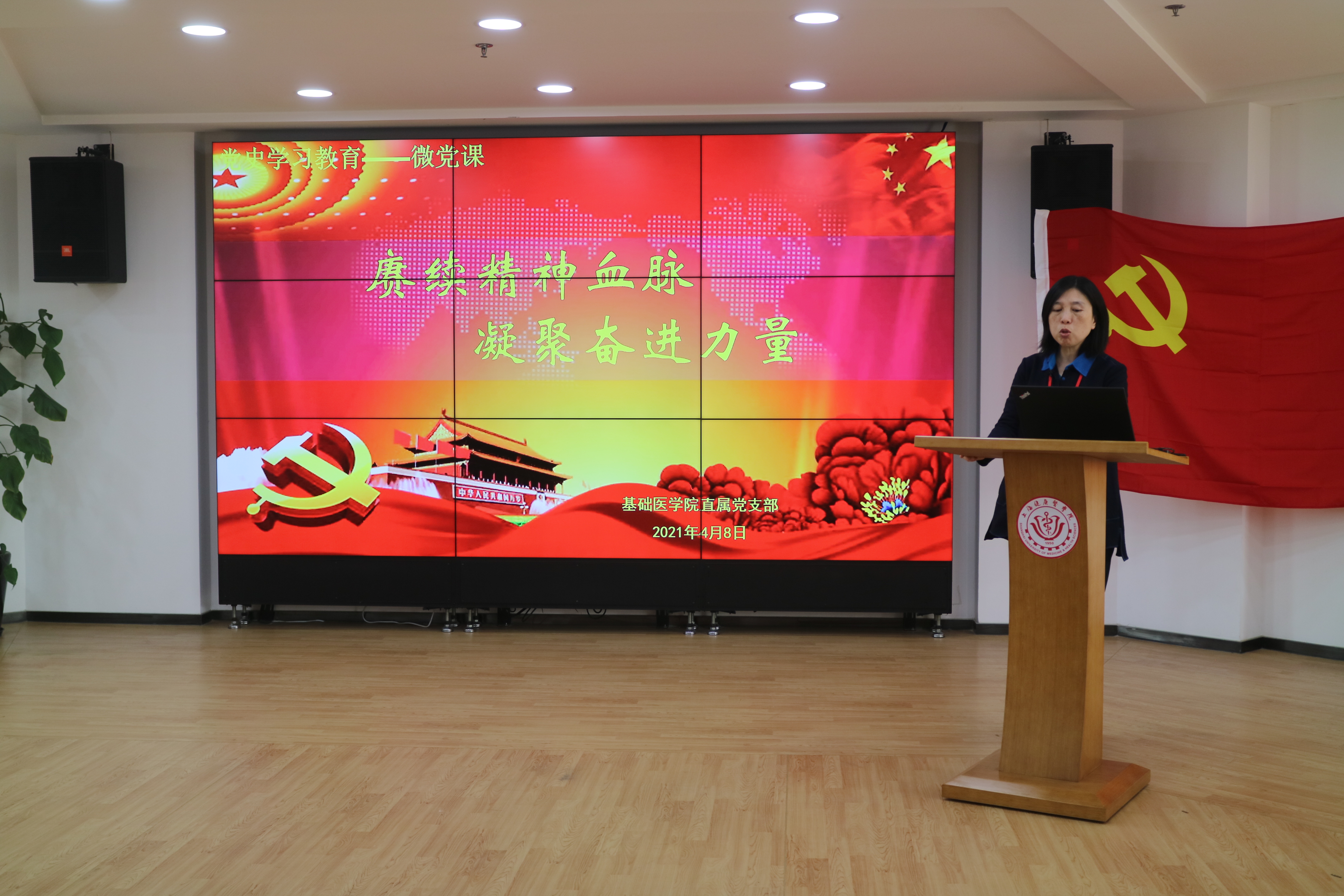 为大力推进党史学习教育深入开展,强化党员党性教育,增强“四个意识”、坚定“四个自信”、做到“两个维护”,4月8日下午,基础医学院直属党支部组织全体党员在北苑1号楼500党建活动中心开展了“赓续精神血脉 凝聚奋进力量——共上微党课”主题党日活动。活动由直属党支部书记程伟主持。