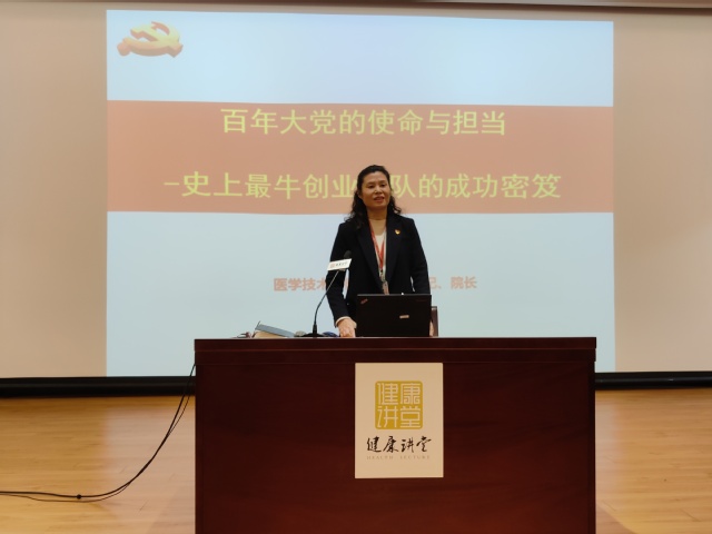为了进一步使健康学子对百年大党波澜壮阔的奋斗历程有更深刻的了解,对中国共产党在中华民族伟大复兴过程中所起到的核心作用有更清晰的认知,医学技术学院本学期申办了学生工作部主办的健康讲堂之党史分讲堂,邀请老党员、思政教师、党团干部着重讲解党史,启蒙思想,引领方向。4月14日下午17:00在北苑200人报告厅,系列讲座第一讲“百年大党的使命与担当——史上最牛创业团队的成功密笈”,由医学技术学院党总支书记兼院长刘敏娟老师开讲。