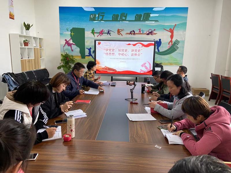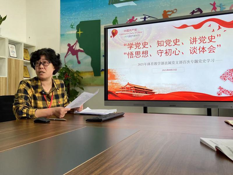 中国共产党的奋斗史是一部波澜壮阔的历史,在她的领导下,广大党员和全国各族人民经过艰苦卓绝的努力,开创了中国发展的崭新纪元。根据党史学习教育领导小组办公室关于党史学习教育工作提示要求,2021年4月15日上午,体育教学部直属党支部在南苑1号楼206会议室开展首次专题党史学习,会议由直属党支部书记郁建新主持,学部全体党员参加。