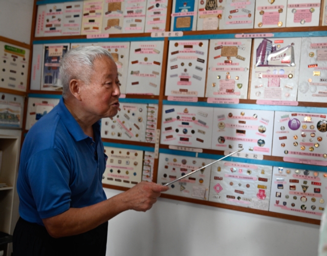 楼老先生是虹口区收藏协会的发起人之一,毕生酷爱收藏,并已坚持收藏校徽20余年。墙面上展示着数百枚全国各大高校及上海市中小学学校校徽。校徽、校训是一所学校的文化和历史的核心,楼老为大家讲述了各所学校校徽的设计特点及背后的思想内涵,结合校训文化激励着年轻人。通过楼老的讲述,大家更明白了一枚枚校徽里蕴含着优秀传统文化的精髓,经过了时间的沉淀,历久弥新、震撼人心。