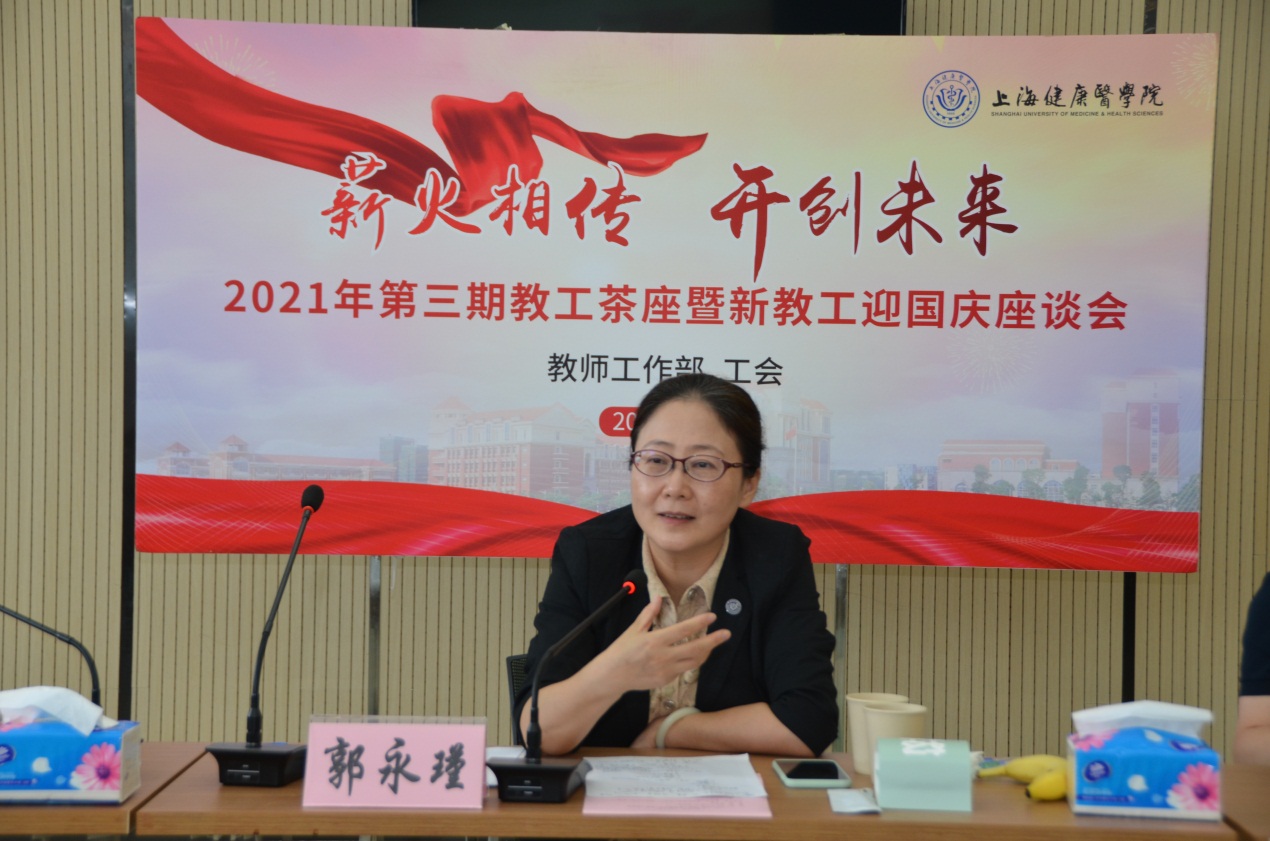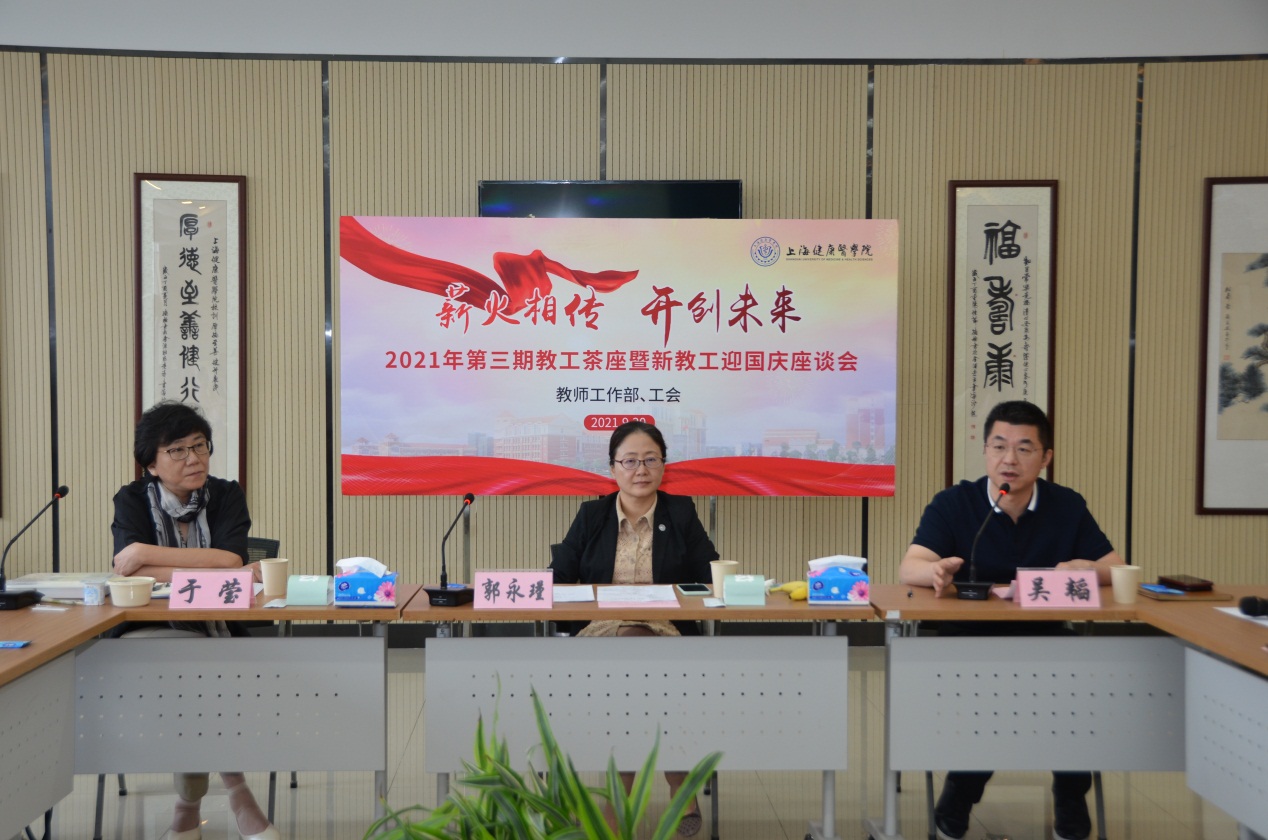 九月桂飘扬,秋意渐浓,9月30日中午,“薪火相传,开创未来” 2021年第三期“职工茶座”暨新教工迎国庆座谈会召开。校党委书记郭永瑾,党委副书记、校长吴韬,党委副书记、工会主席于莹出席会议,党校办、人事处、教师工作部、团委、青年教师联谊会主要负责人,部分老教师代表与新进教师代表50余人出席会议,会议由工会常务副主席凌文惠主持。