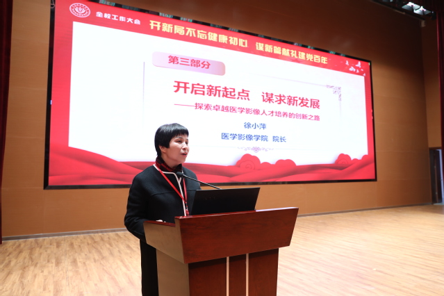 医学影像学院院长徐小萍以“开启新起点,谋求新发展——探索卓越医学影像人才培养的创新之路”作了发言,分享了学院党建工作、人才培养、专业建设、教学体系和师资队伍建设情况,她表示,学院要主动对接国家重大战略发展需求,主动适应教育现代化和医学教育创新发展的要求,坚持立德树人根本任务和紧紧围绕人才培养能力这个核心点来引领和落实学院各项工作。