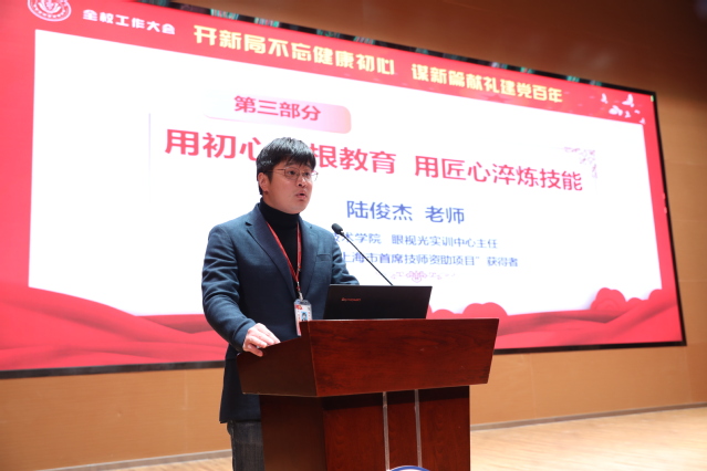 医学技术学院眼视光实训中心主任、“2020年上海市首席技师资助项目”获得者陆俊杰老师以“用初心植根教育,用匠心淬炼技能”为题分享了自己成为眼视光技术行业高技能型人才的成长历程和心得体会。