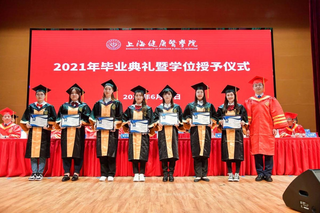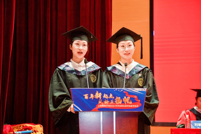 奋发有为载誉归,典礼上,沈国芳副校长宣读了2021年度上海市优秀毕业生及校级优秀毕业生名单,全体校领导为优秀毕业生代表颁奖。吴韬校长为获得第三届校长荣誉学位的14位优秀学子致词,并颁发奖状。所有的努力和汗水在这一刻被铭记,成为属于青春的美好回忆。