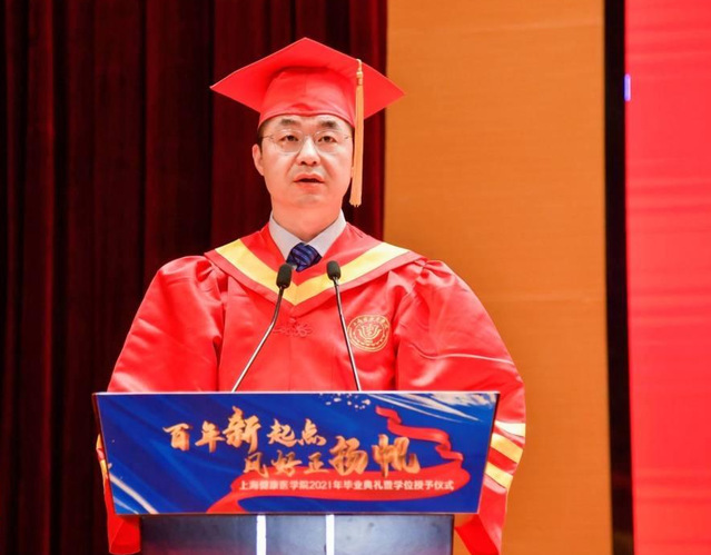 典礼最后,吴韬校长以“勇于担当,让青春在奉献中焕发绚丽光彩” 为题致辞,他在讲话中对全体毕业生提出三点希望:一是希望大家保持自信,满怀爱国奉献的决心,带着中国人的精气神,在与国家民族同呼吸共命运的进程中,开创精彩人生;二是希望大家勇于担当,坚守厚德至善的初心;用“健康人”特有的坚定、务实、气质,为这个社会、这个世界传递更多的光与热;三是希望大家恪守医德,厚植健行康民的仁心。“没有全民健康,就没有全面小康。”谨记:“博学而后成医,厚德而后为医”,在“技”与“德”之间,把“德”永远放在首位,成为一名温暖而有爱的健康守护者。将过往作为序章,从今天起勇敢肩负起时代赋予的历史重任,传承“厚德至善 健行康民”之精神,明爱国之心、立强国之愿、践健康之行,坚定前进信心,做有自信有担当有大爱的“健康人”。