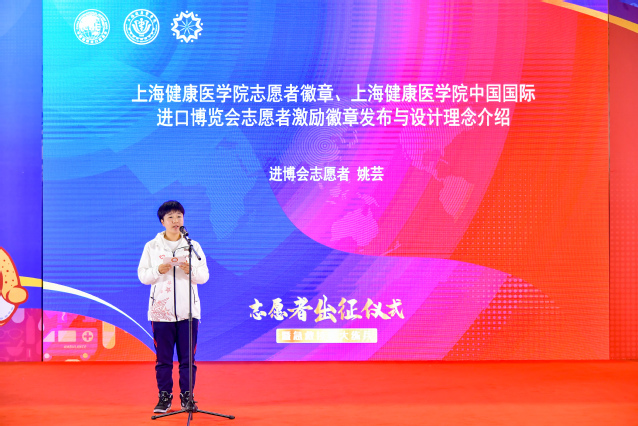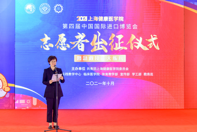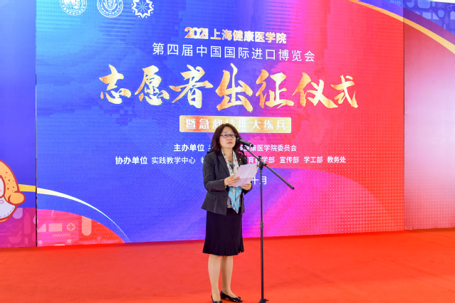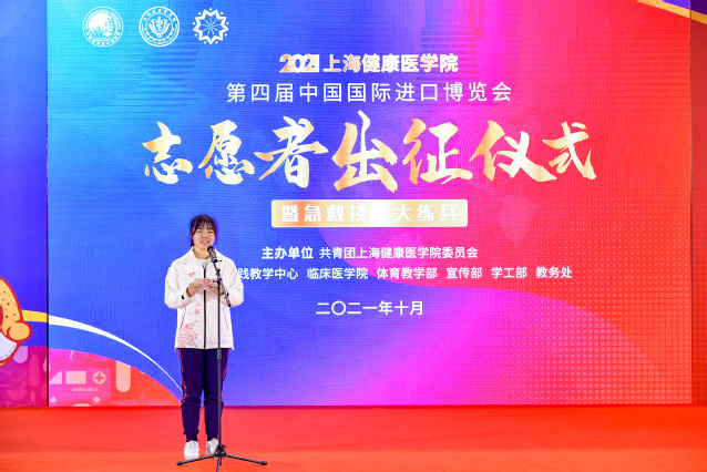 医学技术学院19级学生陈子玥同学作为本届进博会志愿者代表发言,她表示所有“健康小叶子”已整装待发,将不负学校所托,向社会展现健康学子的使命担当,向党和国家展现健康学子的坚定决心,向世界展现健康学子的志愿风采。