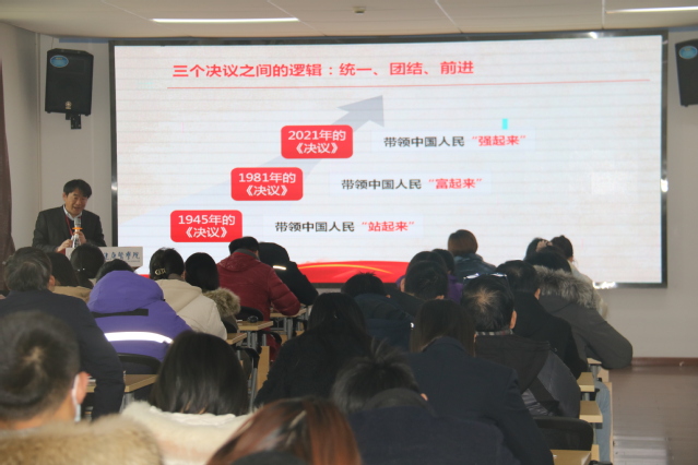 曹月柱副院长从“三个决议:树立正确党史观”、“伟大成就:最为恢弘的史诗”、“风华正茂:新时代的执政党”三个方面对《中共中央关于党的百年奋斗重大成就和历史经验的决议》进行了解读,曹院长首先指出了《关于若干历史问题的决议》(党的六届七中全会)、《关于建国以来党的若干历史问题的决议》(党的十一届六中全会)和《中共中央关于党的百年奋斗重大成就和历史经验的决议》三个决议之间的逻辑关系,希望全体党员树立正确的党史观;接着,曹院长用“浴血奋战、百折不挠,自力更生、发愤图强,解放思想、锐意进取,自信自强、守正创新”32个字讲述了党的百年奋斗取得的伟大成就,重点讲述了新时代中国特色社会主义时期十三个方面的伟大成就,要求全体党员深刻领悟“两个确立”的决定性意义;最后,曹院长希望全体党员牢记“中国共产党是什么、要干什么”根本问题,大力弘扬伟大建党精神,埋头苦干、勇毅前行,为实现第二个百年奋斗目标、实现中华民族伟大复兴的中国梦而不懈奋斗。