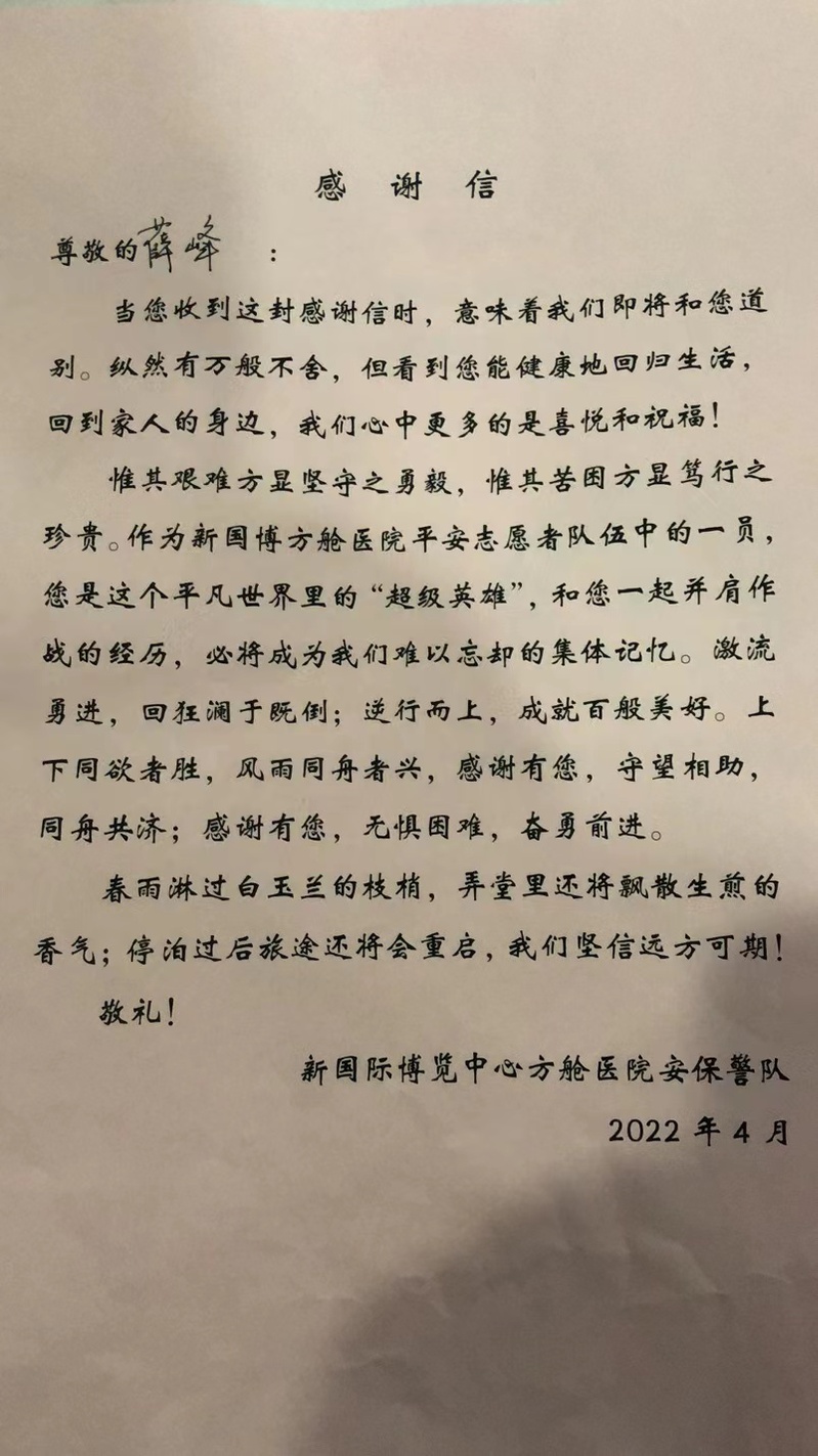 薛峰老师是学校财务处的一名普通职工,在这次新冠疫情中女儿检测出阳性,女儿年仅13岁,薛老师义无反顾选择于4月13日陪伴女儿进入新国际博览中心W2方舱。进入方舱后,薛峰老师一边照顾女儿,一边积极投身志愿者服务。每日的清晨5点,大家都在睡梦中时,志愿者们已经开始搬运早饭,有序组织分发,午饭、晚饭亦是如此,作为一个核酸阴性的人员,薛峰老师在这阳性的环境中也毅然走到每一位舱友的床前,为他们送上饭菜,没有退缩。每当护士站的物资到来,薛峰老师等几个男性志愿者冲锋在前,帮助搬运摆放,让医护人员安心做他们的本职工作。当新病友来到,薛峰老师和其他志愿者帮助分发被褥床套,指引他们到达分配的床位,介绍方舱的情况。当做核酸时,他又井然有序维护现场秩序,通知指定仓位的人员进行核酸。